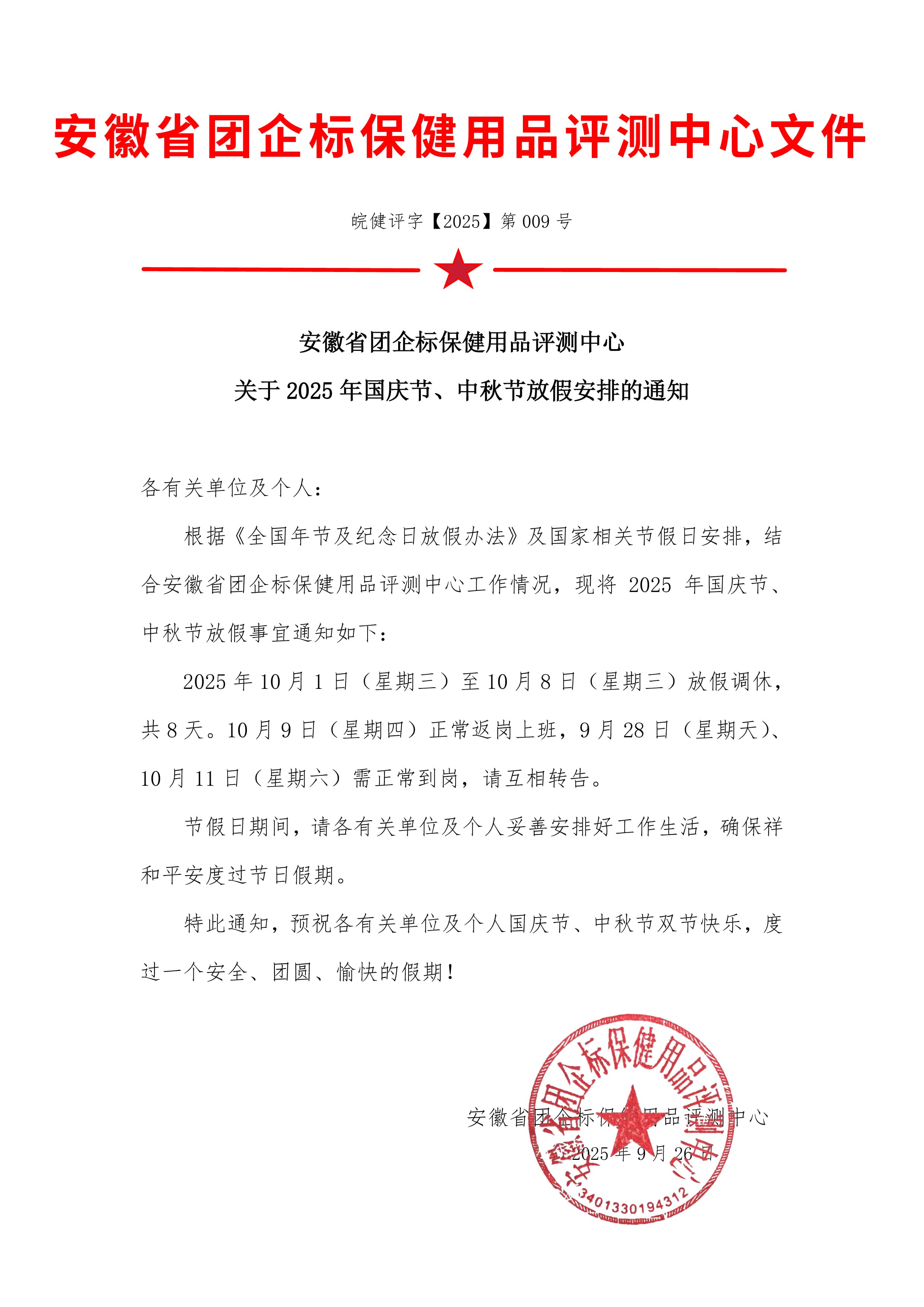 安徽省团企标保健用品评测中心关于2025年国庆节、中秋节放假安排的通知